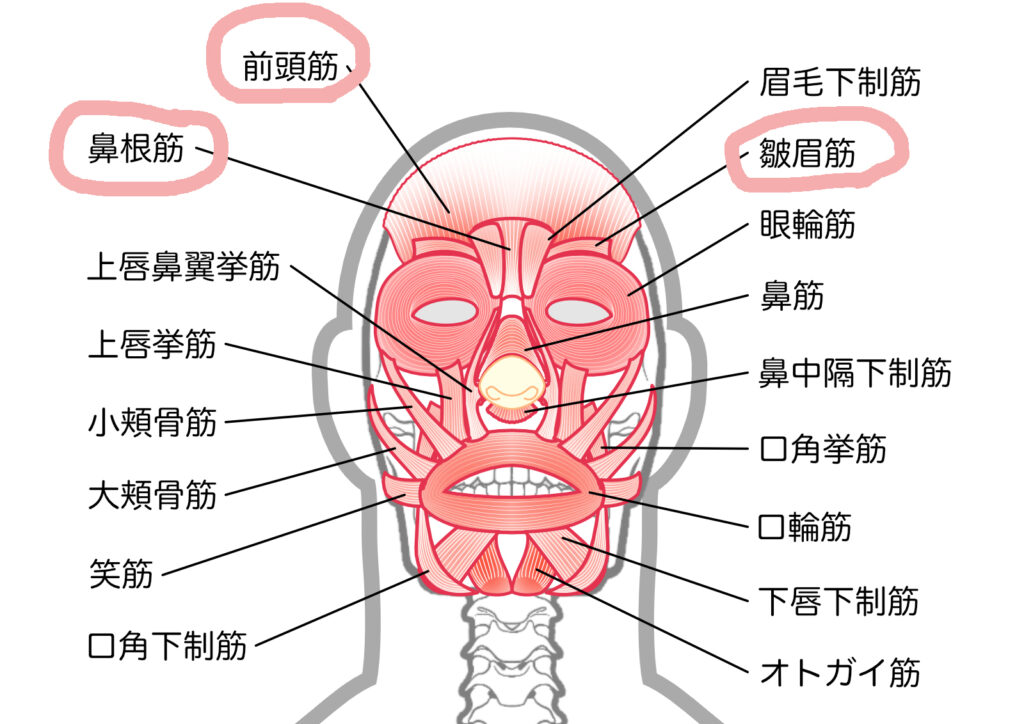 → 主に「皺眉筋(すうびきん)」「鼻根筋(びこんきん)」が収縮し、眉を寄せる動きでできる。